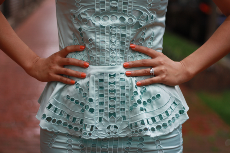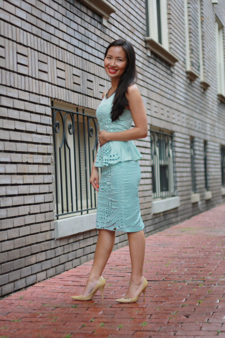 A matchy peplum top and skirt with teal cutouts was just what I needed to turn a rainy day into bright one. What are you doing to prevent rain day blues?