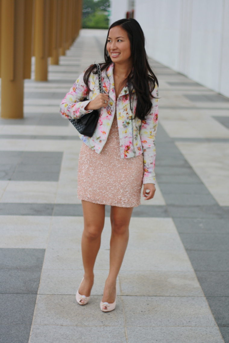 Remember when I told you I wrote an article on personal shoppers in DC for the Washingtonian? (No worries if you don't, just click here.) While the goal of the article was to find the best personal shopper in DC, my primary goal was to find a dress to wear on my anniversary date with my husband. I'm happy to tell you this past weekend we had our big date, and I finally got to wear my sparkly dress! On our agenda for that day - see the The Addam's Family musical at The Kennedy Center and then have dinner at Bourbon Steak. I love to get dressed up (obviously) so I knew I wanted to wear something extra special this day and that that something needed to be elegant, fun, flirty, and comfortable - all characteristics that my husband makes me feel everyday. The weather was slightly rainy and cool which allowed me to wear this really cool floral biker jacket I found at the Zara sale. I love how the jacket made the dress more wearable for the day but also gave my look some edge.