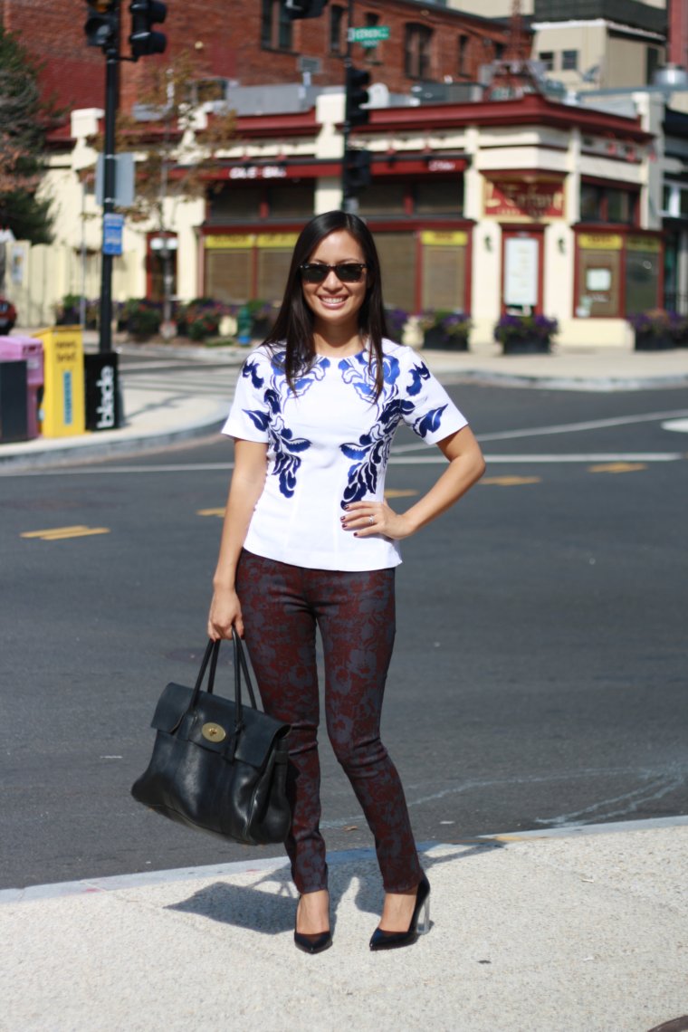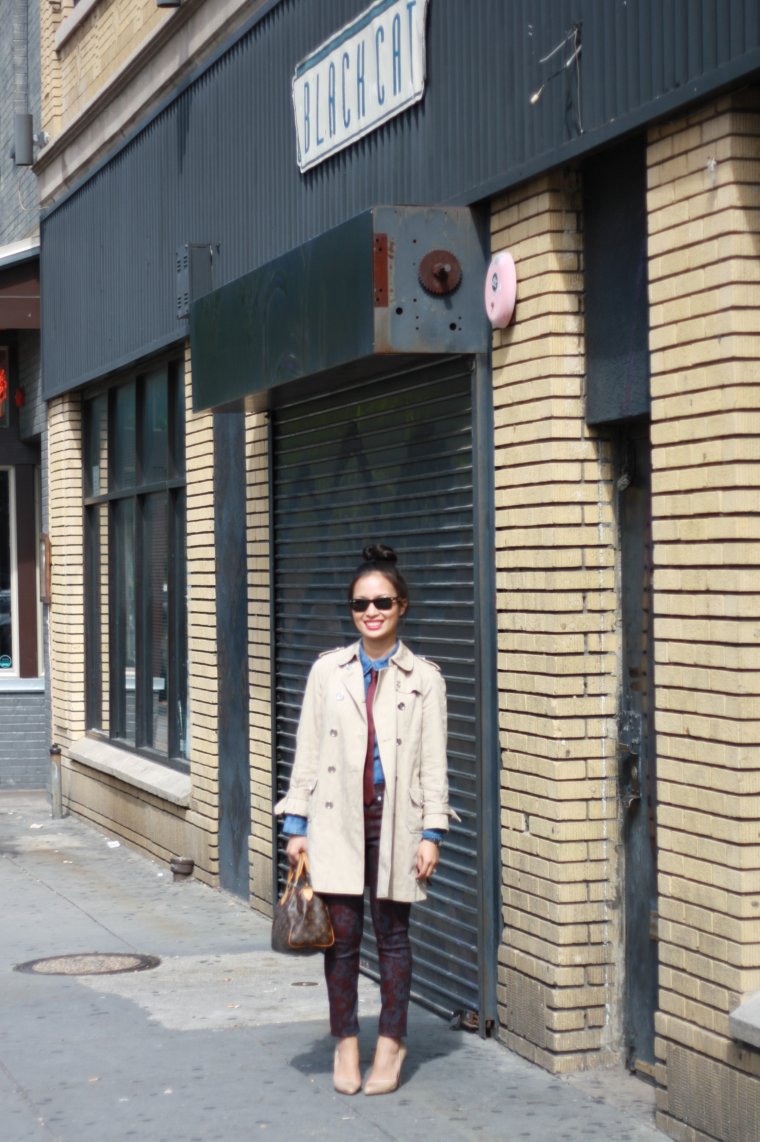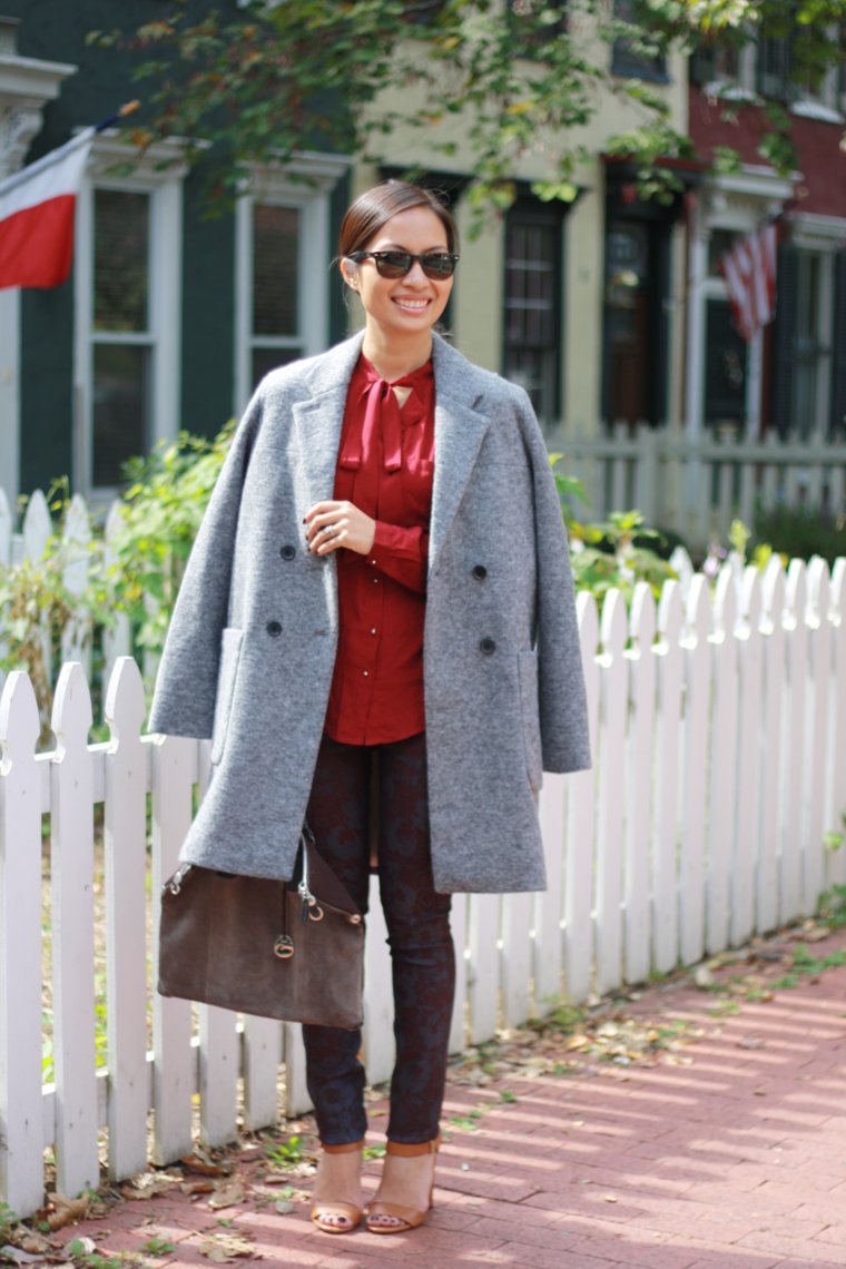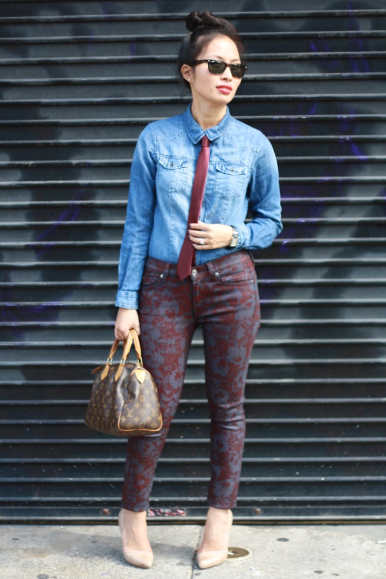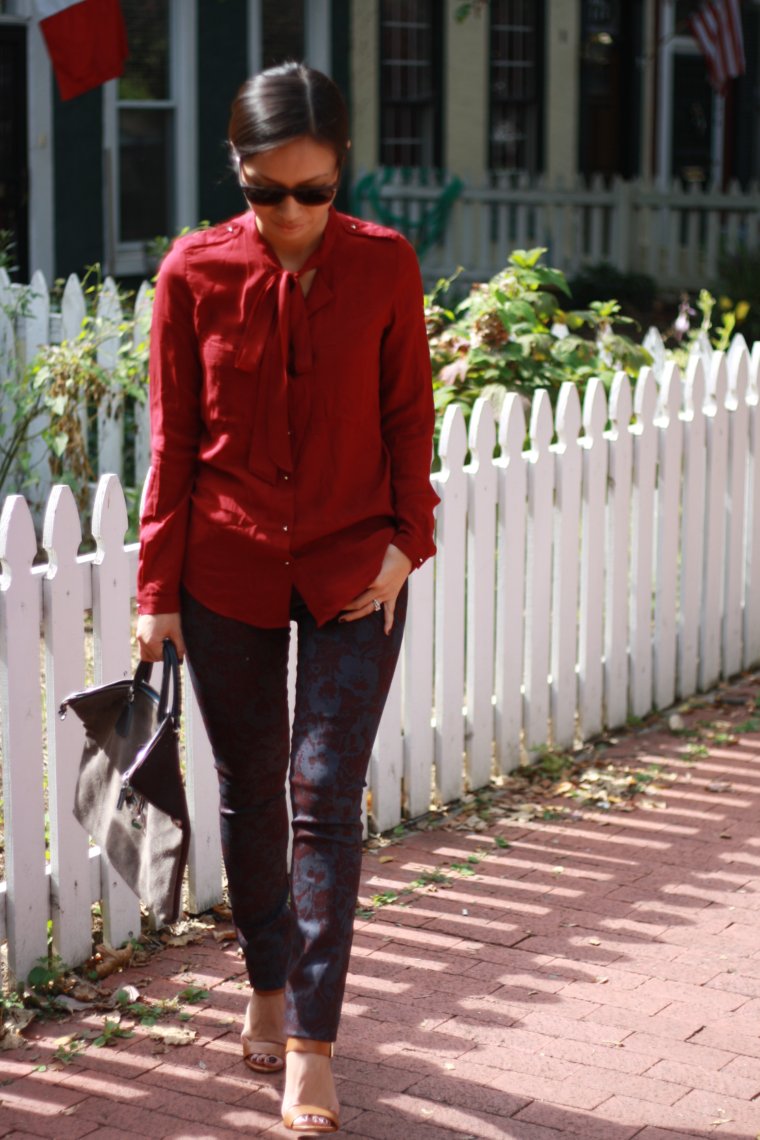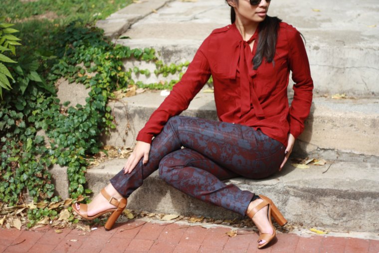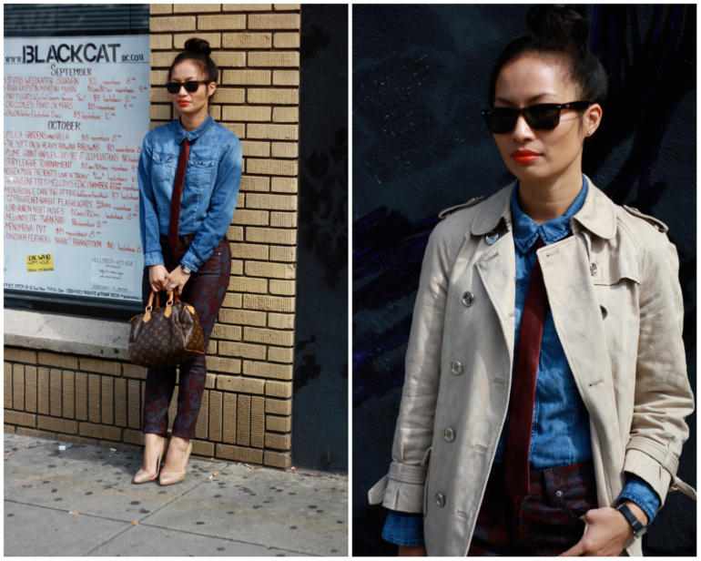 Three = Denim: 7 For All Mankind, The Skinny in Laser Burgundy Floral (c/o 7FAM) / Coat: Coach, old / Top: H&M, old / Tie: H&M, borrowed from my husband / Shoes: L.A.M.B / Bag: LV / Lips: NARS, Heat Wave / Watch: Co. Gift