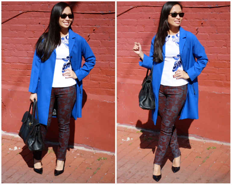 Two = Denim: 7 For All Mankind, The Skinny in Laser Burgundy Floral (c/o 7FAM) / Coat: H&M, recent / Top: H&M, recent / Shoes: Zara, old / Bag: Mulberry