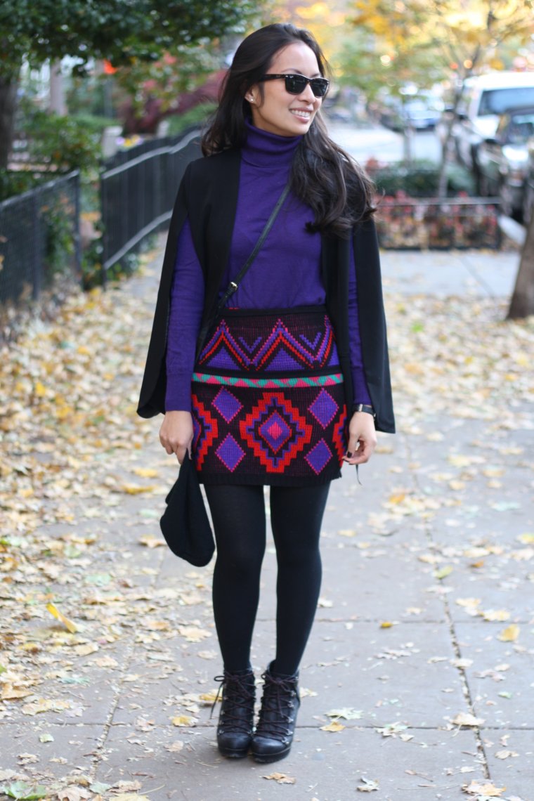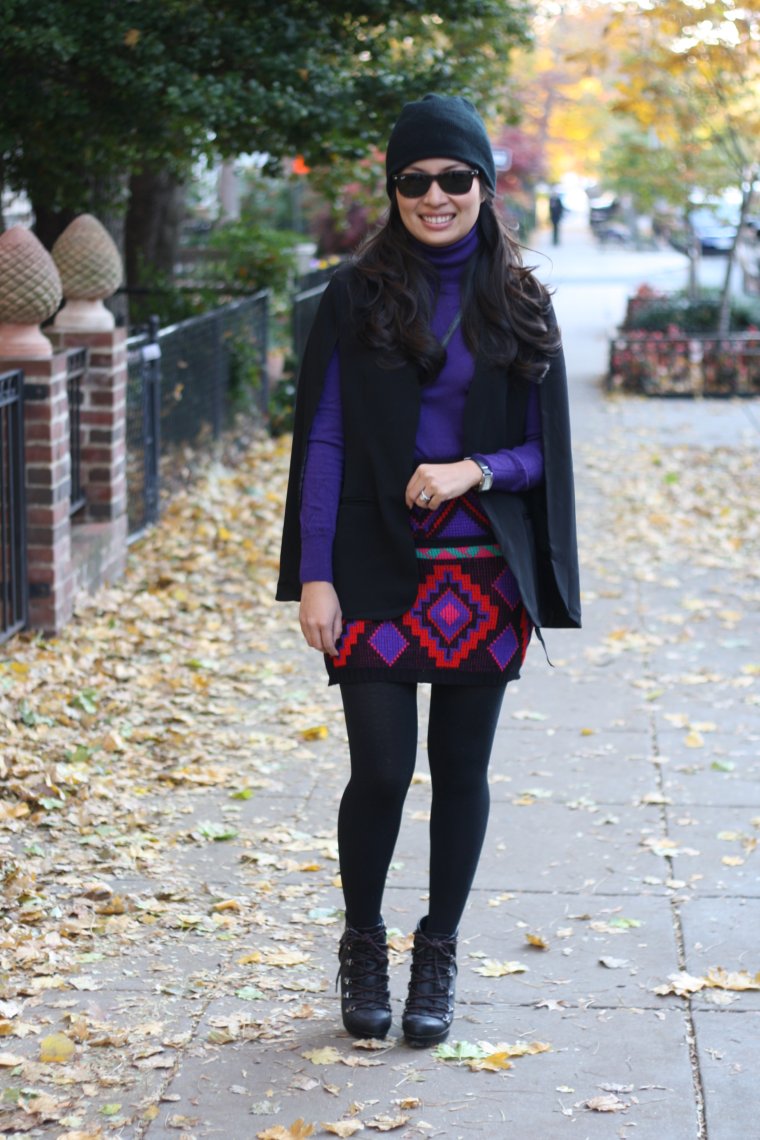 Turtleneck: J. Crew / Cape: WornAbroad.com / Skirt: La Petite Marmoset (LPM) Redesigned Vintage / Tights: Madewell / Boots: G by Guess via DSW / Beanie: DC street vendor / Sunglasses: Ray-Ban / Watch: Co. Gift