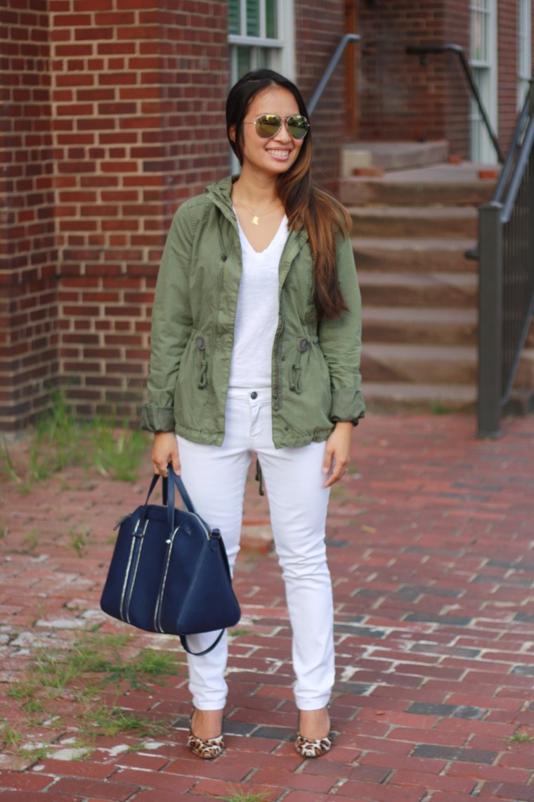 Parka: H&M \\ T-Shirt: J.Crew \\ White Denim: Jessica Simpson via Marshalls, c/o #fabfound \\ Leopard Kitten Heels: Bandolino via Marshalls \\ Aviators: H&M \\ Bag: Zara \\ Necklace: DC State Pride Necklace from She's Unique, c/o