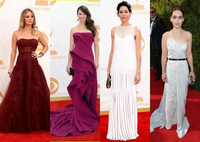 Emmy Celebs: Kaley Cuoco in Vera Wang (img), Linda Cardellini in Donna Karen Atelier (img), Sandrine Holt in Honor (img), Emilia Clarke in Donna Karen Atelier (img)