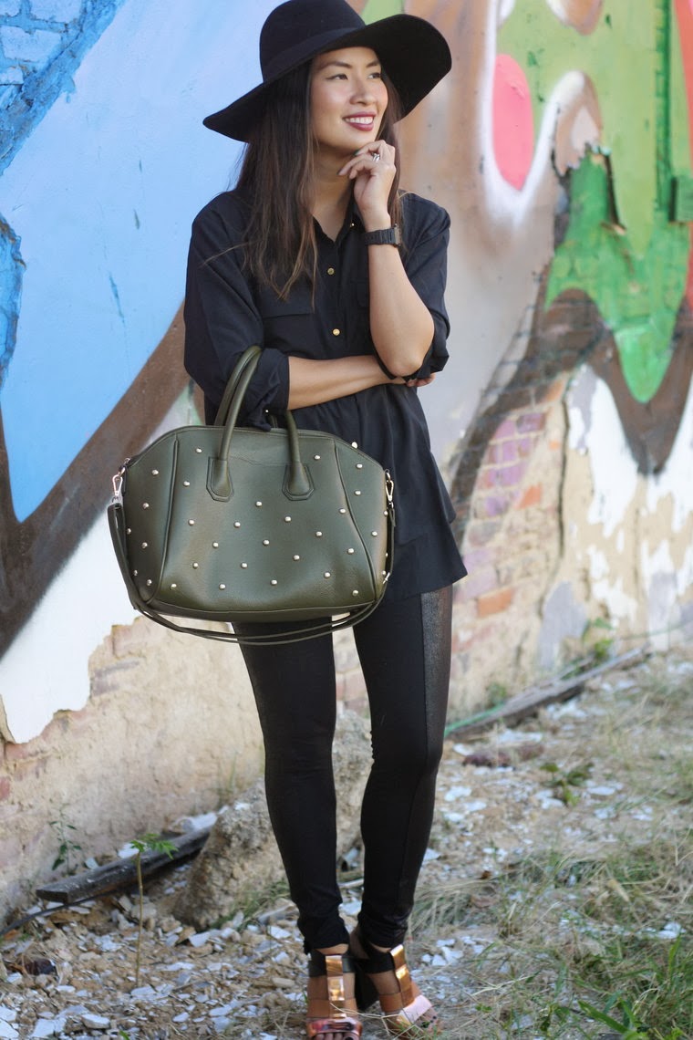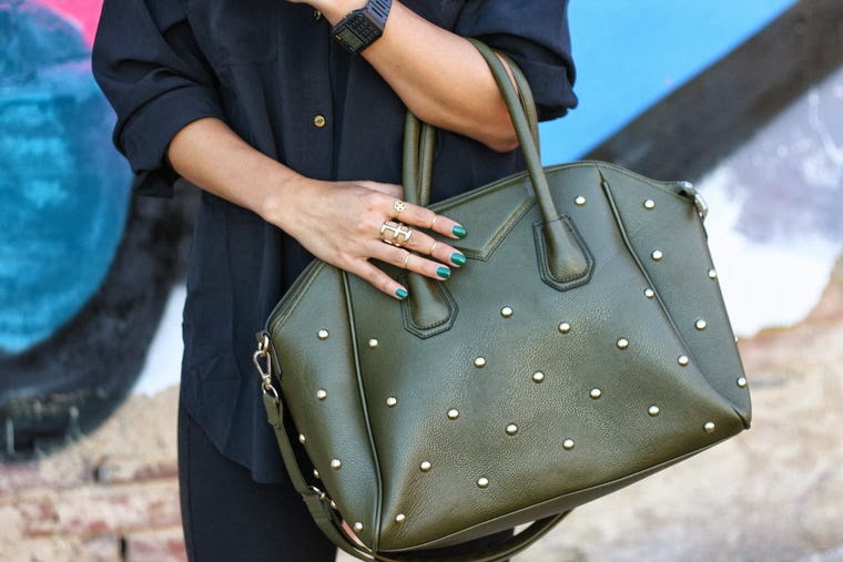 I'm so happy to share with you that I have been chosen as a member of the Marshalls' Project Fab team! What that means is that, throughout the year, I'll be sharing the amazing items that I've #FabFound at Marshalls. First up is this beautifully structured, olive green, studded, bowler bag.