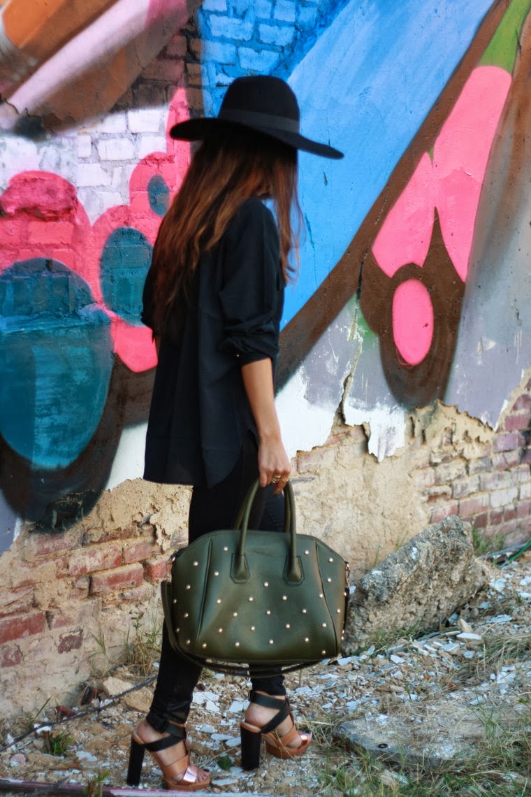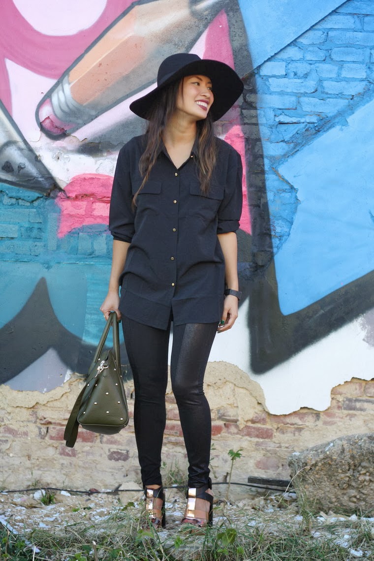 Top: Juicy Couture Sloane Blouse via Marshalls at 50% off retail, c/o #FabFound \\ Leather Leggings: Star Power by Spanx \\ Sandals: Elizabeth and James Women's Sam Platform Sandalvia Marshalls #FabFound \\ Studded Bag: Marshalls #FabFound, c/o only $19.99!! \\ Hat: H&M \\ Watch: Casio Men's CA53W Databank Calculator Watch\\ Rings: She's Unique c/o, H&M, & Nordstrom Rack \\ Nails: Butter London