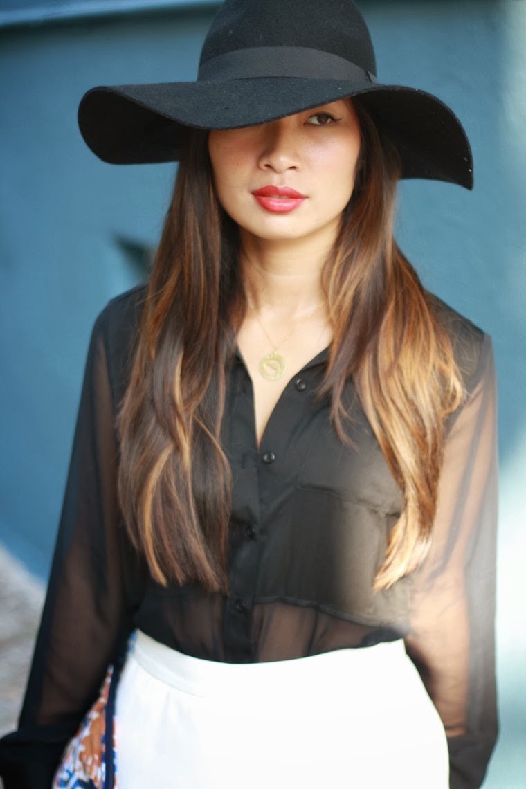 Shirt: Free People, old (get it in white here, more colors linked below), last worn here. Pants: Zara, old (similar here), last worn here. Hat: H&M (similar here). Shoes: Zara, old (similar here), last worn here. Clutch: Love, Cortnie. Necklace: Wear It, Don't Bear It, c/o. Watch: Michael Kors. Moissanite Earrings: Charles & Covard, c/o. Nails: Essie Bobbing for Baubles