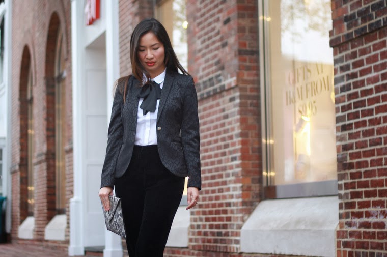 Once I started trying the clothes on, in attempts to put together a cohesive outfit, my vision and strategy began to evolve. I then went back out to the floor to look for pieces that were classic but with a twist - basic black pants but in velvet, a classic black blazer but with a subtle leopard pattern, and a white blouse with a bow and jeweled button - all pieces that I love and could easily wear with other items in my closet. (The clutch I'm carrying is also from H&M but purchased last year.)
