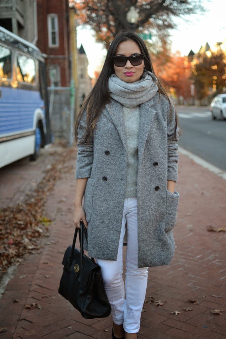 Don't put away those white jeans or pants just yet. If you think you can only wear them before Labor Day, then you're wrong. Pull on a grey sweater over said pants for one of my favorite A/W color combinations - grey (or gray) and white.
