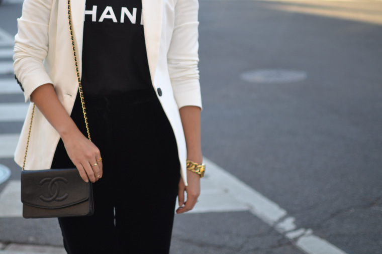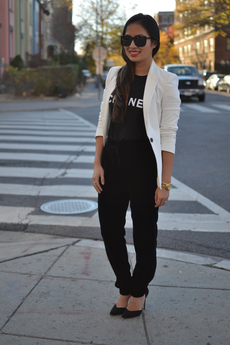 Blazer: Zara. T-Shirt: Virgo via Outfitted Pop-up Shop. Pants: H&M, c/o. Shoes: Zara. Bag: Chanel. Lips: Maybelline Color Elixir Signature Scarlet, c/o. Watch: Michael Kors. Sunglasses: Karen Walker. Earrings: Moissanite.com, c/o. Photos taken by Carrrrlis.