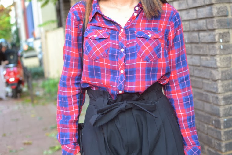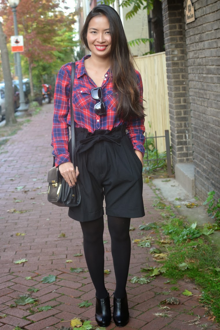 Plaid Shirt: H&M, old (similar). Shorts: Zara, old. Tights: Spanx. Shoes: Michael Antonio c/o South Moon Under. Bag: 3.1 Phillip Lim for Target. Sunglasses: Karen Walker. Photos taken by Carrrrlis.