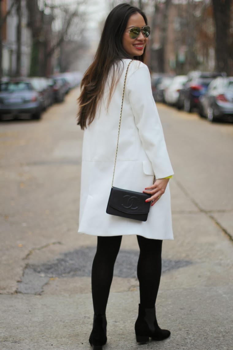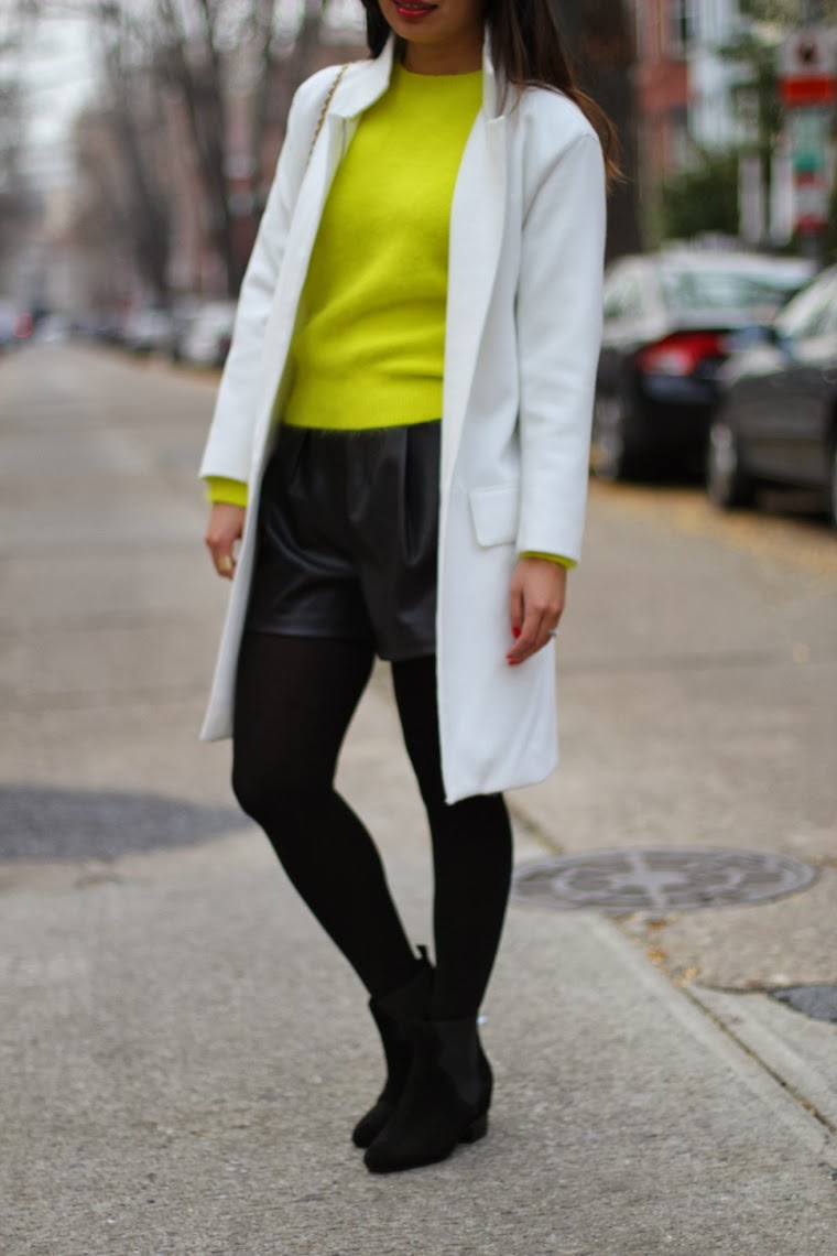 Coat: Zara, previous season. Sweater: H&M (similar). Leather Shorts: Zara. Tights: Spanx. Booties: Zara recent Black Friday sale. Bag: Chanel. Sunglasses: H&M. Nails: OPI Big Apple Red. Lips: NARS Heat Wave.Photos taken by Carrrrlis.