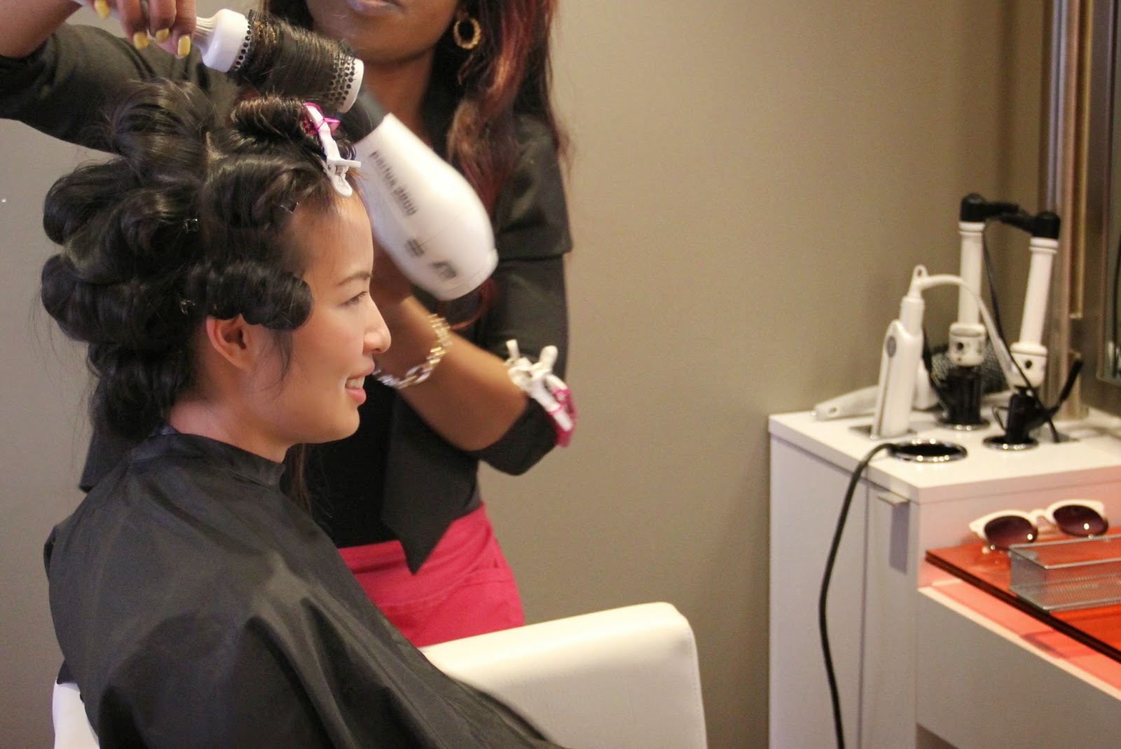 First pick out your hairstyle from the blo hair menu while sipping on bottomless mimosas, champagne, water, or tea (there may be more options but it was kind of hard for me to pay attention after I heard mimosa). I also chose the "holly would" hair style.