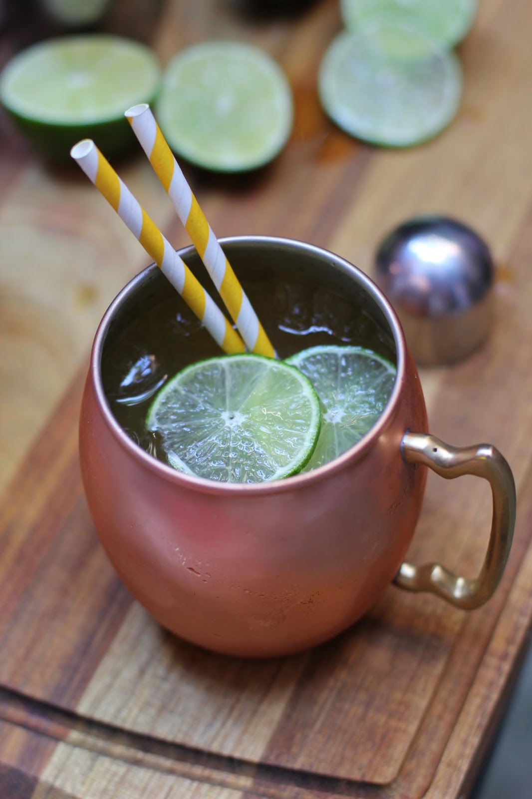 Squeeze 1/2 of a lime over ice in a shaker. Toss the shell of the lime into the mug along with ice. Pour vodka and top with ginger beer. Shake. Pour into copper mug. Garnish with a lime wheels and paper straws.