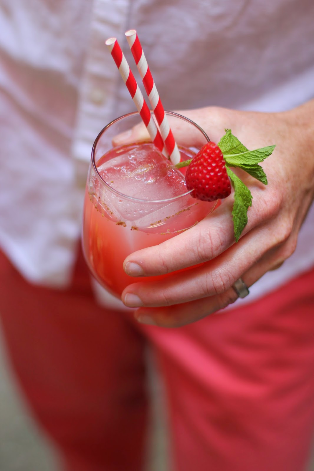 Puree 2 cups of strawberries and mix with iced green tea and lemon juice. Garnish with a strawberry, mint, and paper straws. Add sugar, rum, champagne, or vodka as desired.