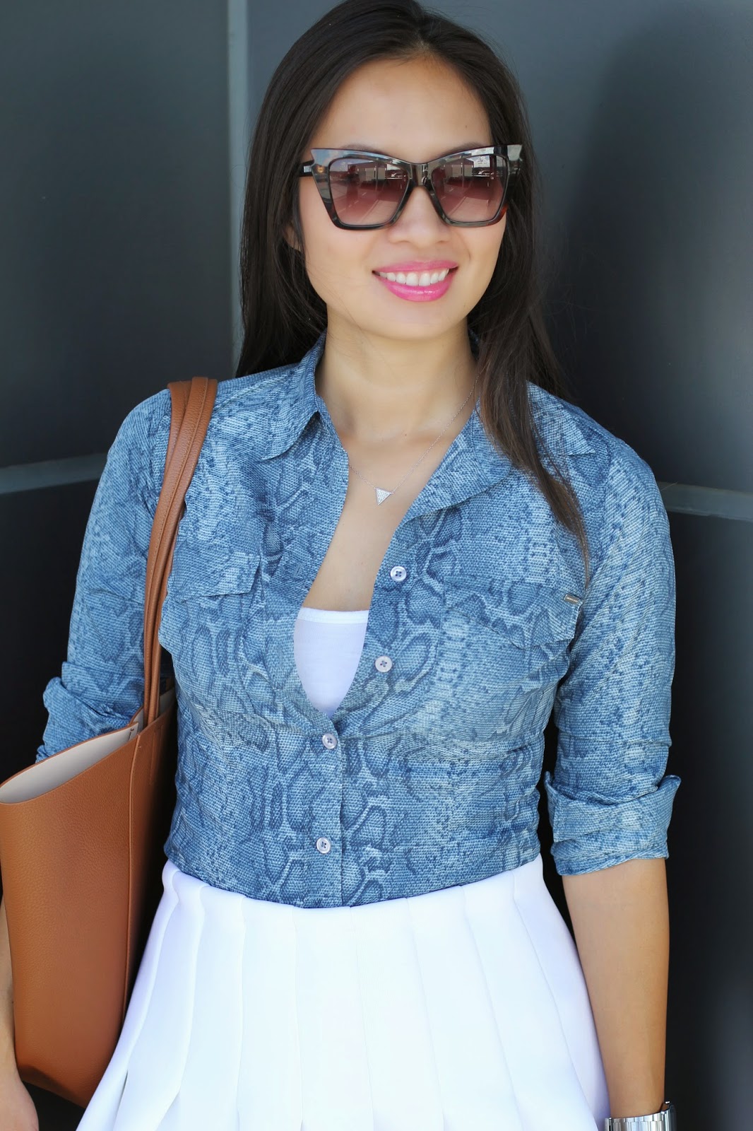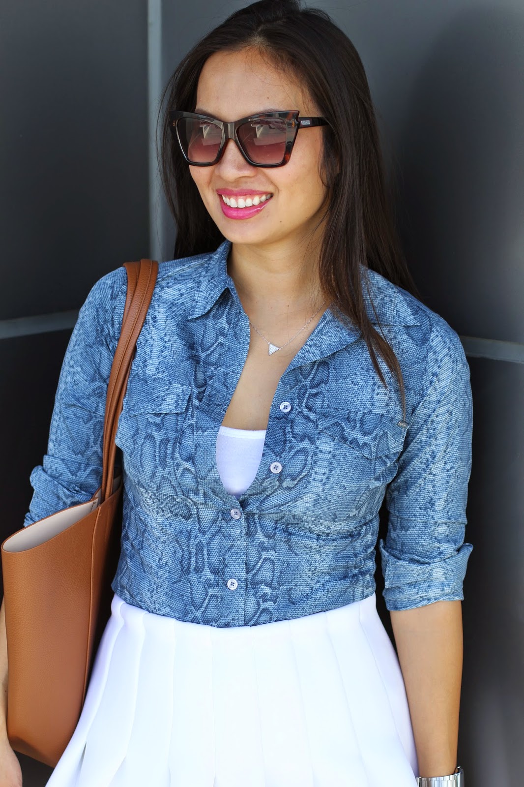 MICHAEL KORS SNAKESKIN TOP, TRIANGLE NECKLACE FROM SHE'S UNIQUE, LE SPECS RAPTURE SUNGLASSES, H&M; SHOPPER BAG