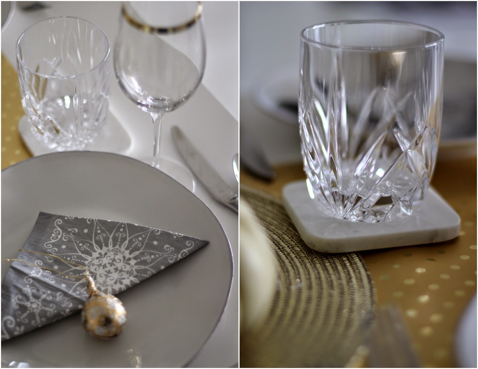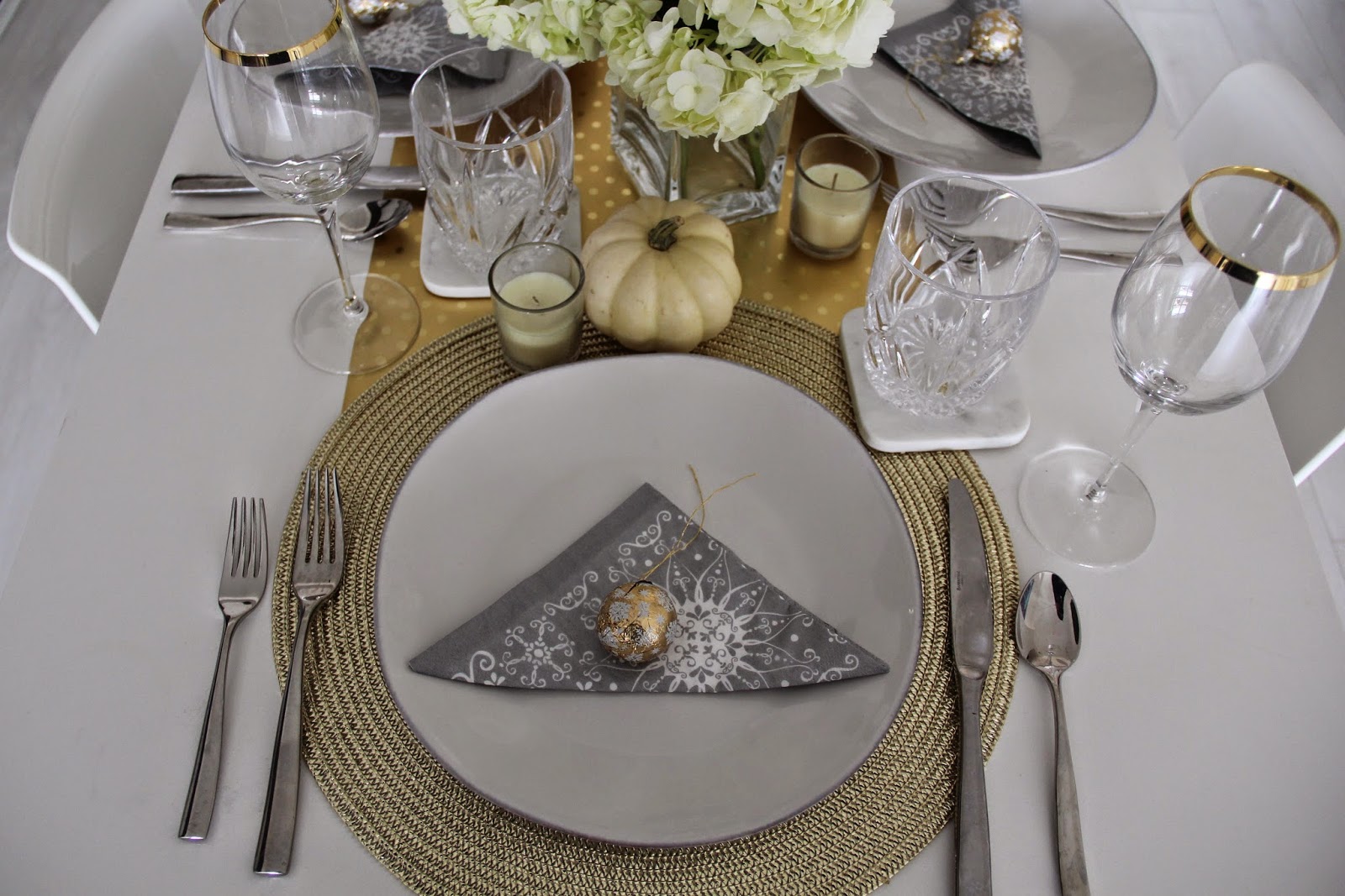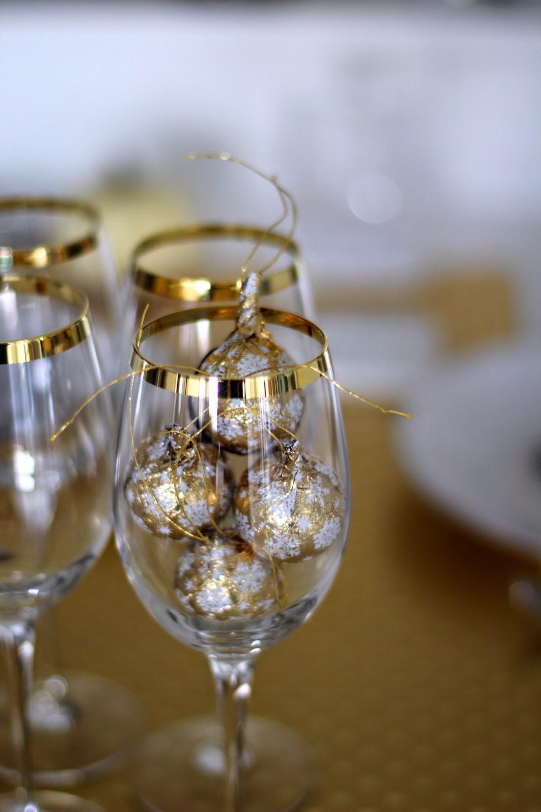 #FabFound at Marshalls: Metallic Gold Placemat ($2.99, Compare at $5), Gold Wrapping Paper with Dots ($2.99, Compare at $5), Bag of Chocolates ($3.99, Compare at $6)I love the look of a table runner but don't like storing them or collecting a bunch of seasonal items. My solution is to use wrapping paper as a table runner, and then I just recycle the paper afterwards. I also did this for my wedding!