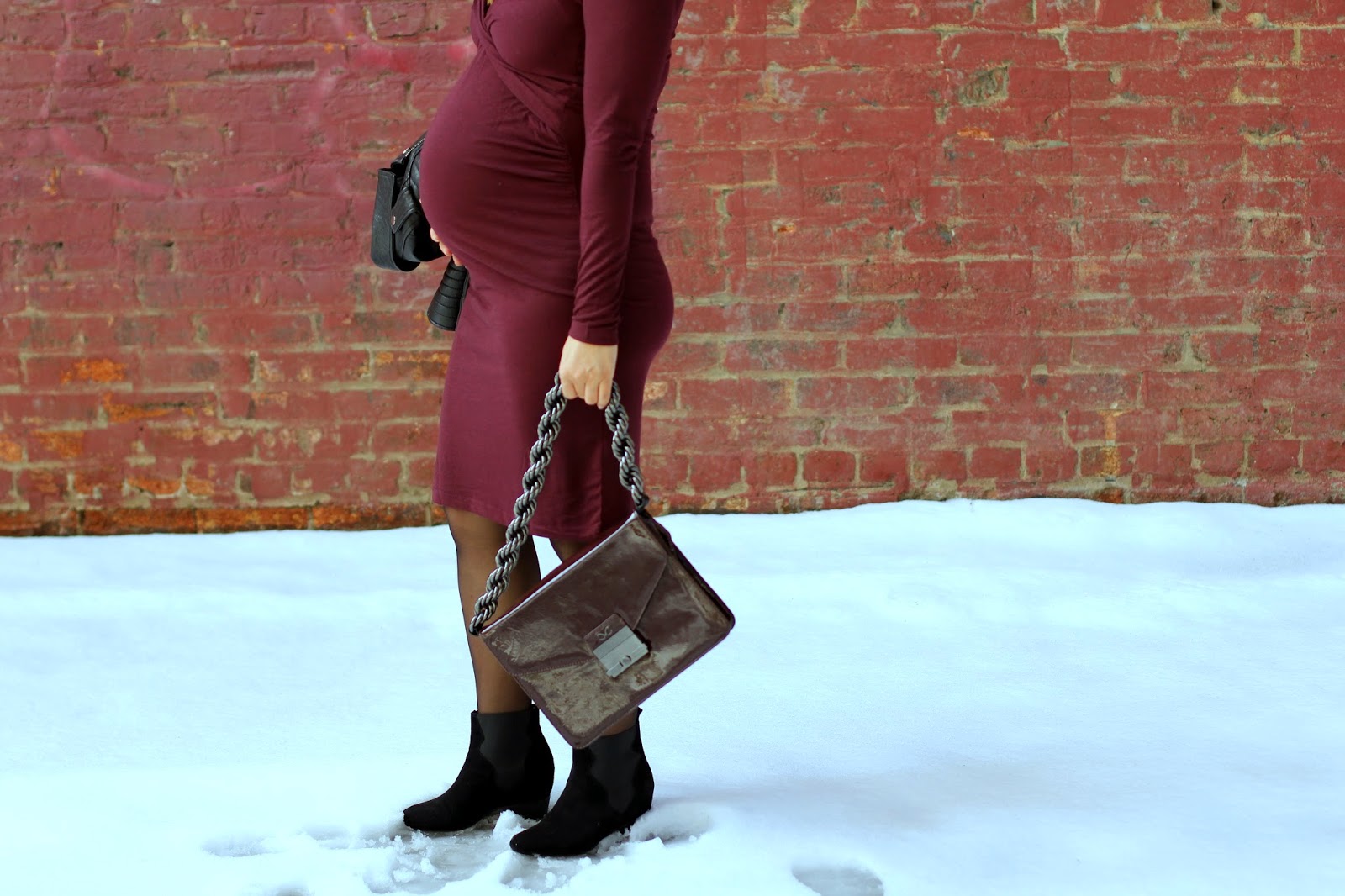 Wearing: ASOS maternity dress, 424 Fifths leather moto jacket, Zara booties, Le Specs Rapture sunglasses, Monika Chiang bag, H&M; maternity tights