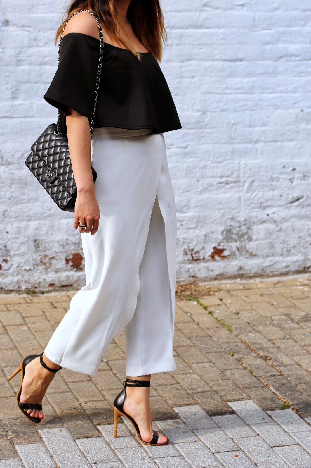 Boohoo top, Zara culottes, Tibi heels, Free People sunglasses, Chanel bag