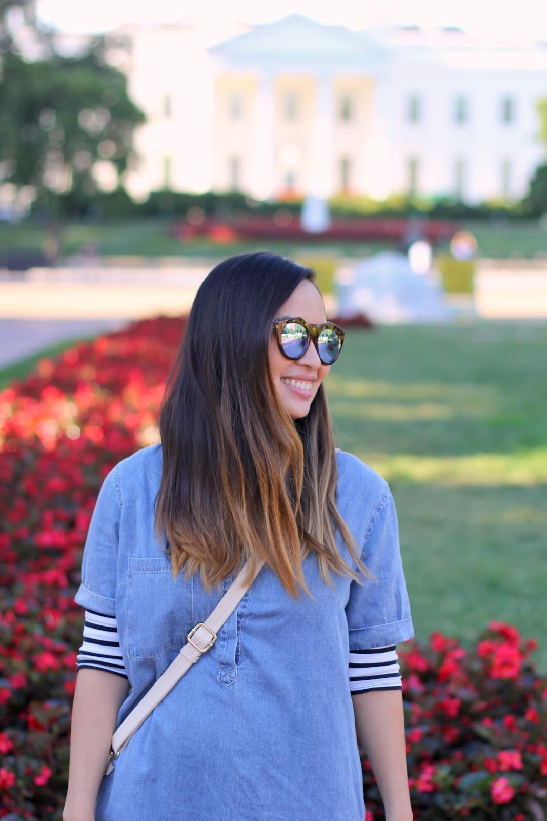Living in DC means living within walking distance from many monumental structures - making it easy to play tourist whenever I can find the time. One cool DC morning, my family and I took the #FABTravelingBag on a walk by the White House. I paired the very versatile bag with a chambray dress layered over a striped shirt and my go-to Nikes for a comfortable and casual look.