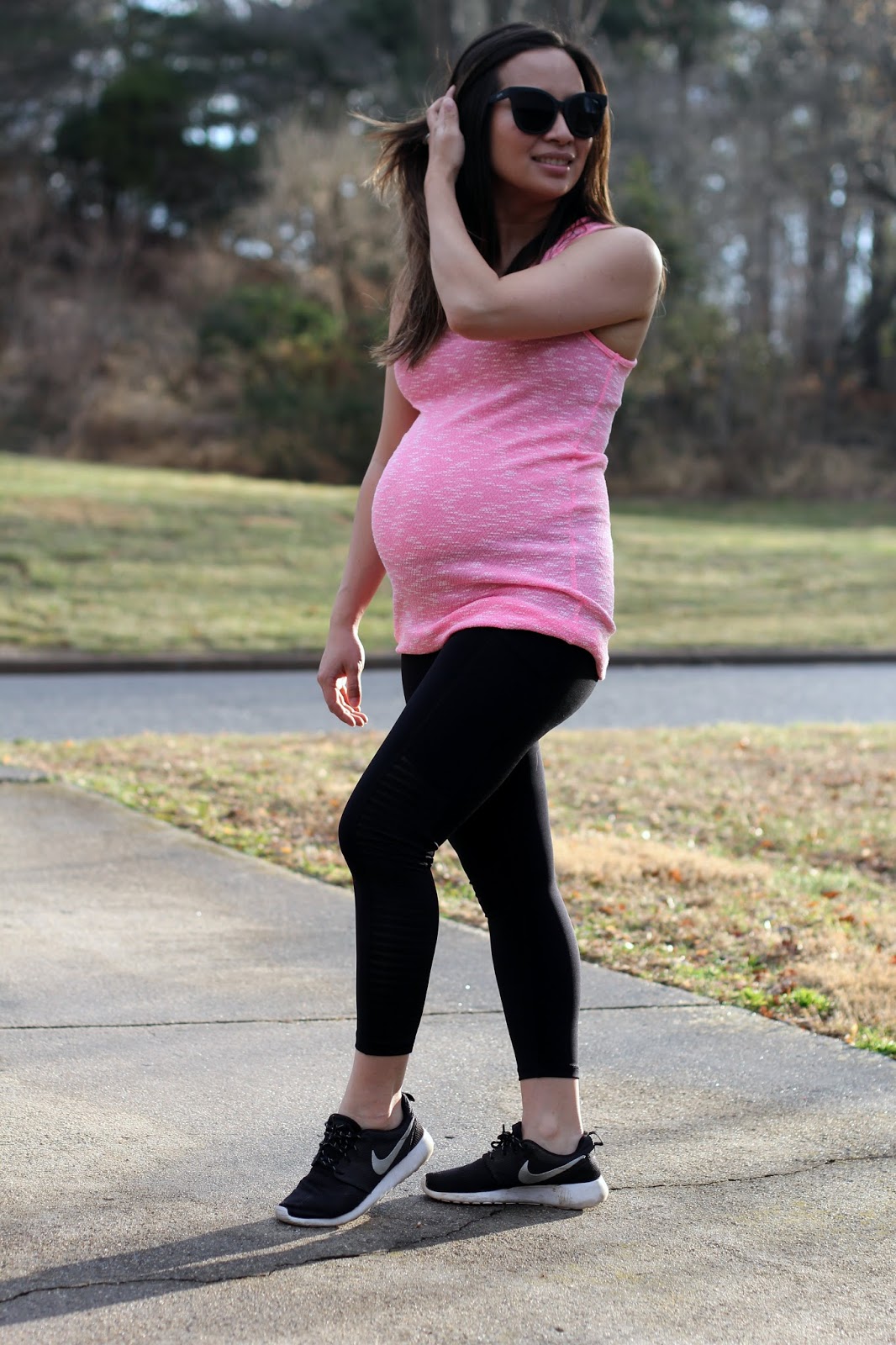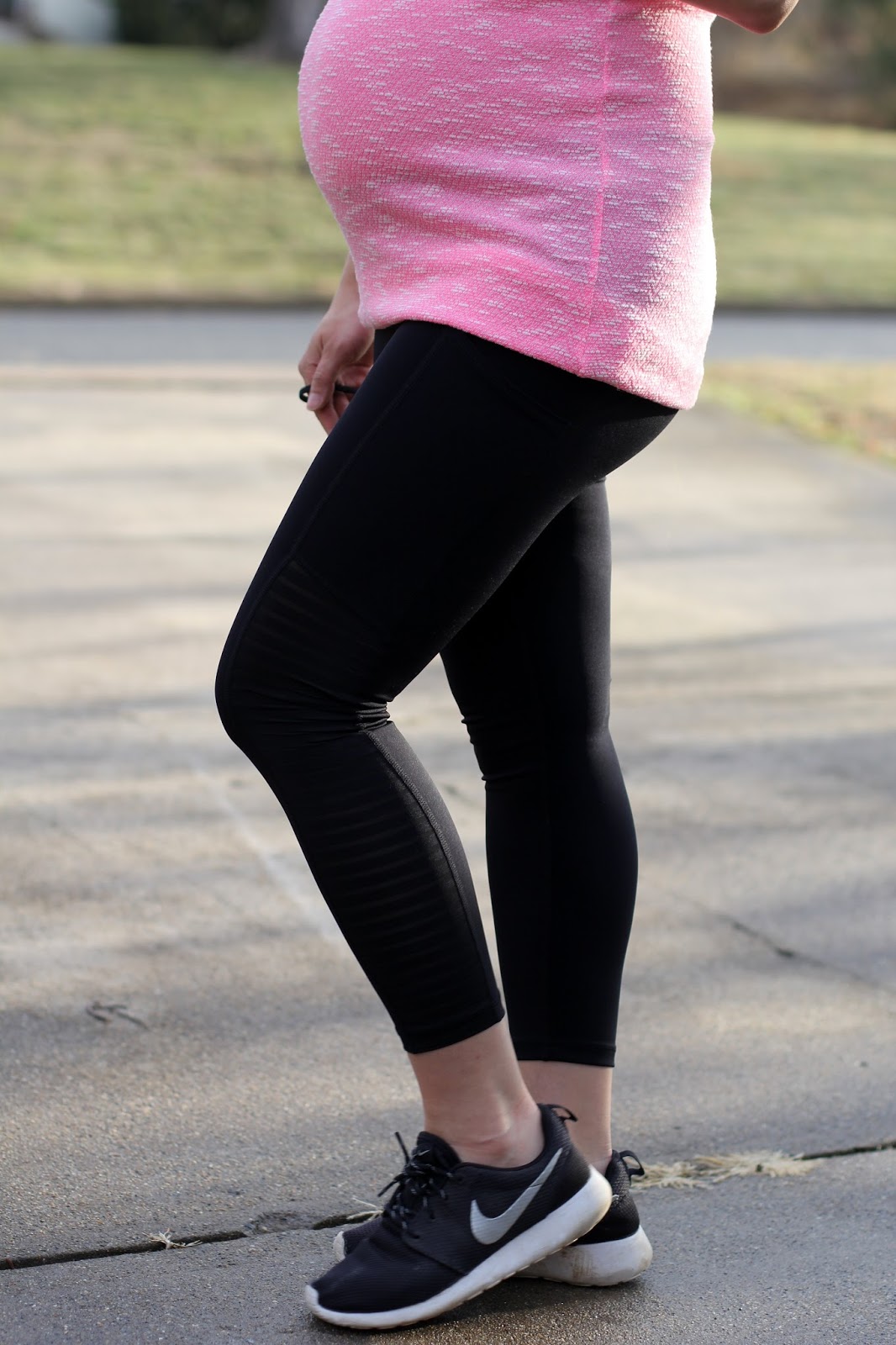 If there's one item of maternity clothing I'd recommend buying it's maternity workout leggings. Personally, I prefer the ones that have a band that goes over the belly. It helps the leggings stay up, and I think they're just more comfortable. I have one pair that sits below my belly and there are certain times and moves where I feel like the waist band digs into me. Also, find a top that's long enough to cover your bump so you're not constantly adjusting yourself or worrying about baring your belly.